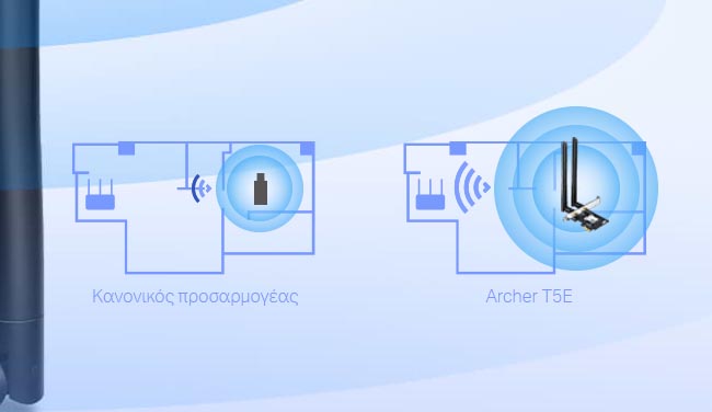 Το Archer T5E είναι ένας προσαρμογέας Wi-Fi PCI Express 802.11ac διπλής ζώνης με ταχύτητες έως 1167 Mbps (867 Mbps στη ζώνη 5 GHz και 300 Mbps στη ζώνη 2,4 GHz), παρέχοντας σήματα Wi-Fi σε δύο ξεχωριστές ζώνες για όλους τις διαδικτυακές σας ανάγκες. Επιλέξτε τη ζώνη 2,4 GHz για σερφάρισμα, ηλεκτρονικό ταχυδρομείο και μέσα κοινωνικής δικτύωσης ή μεταβείτε σε ζώνη 5 GHz για παιχνίδια, ροή βίντεο και μεγάλες λήψεις αρχείων.